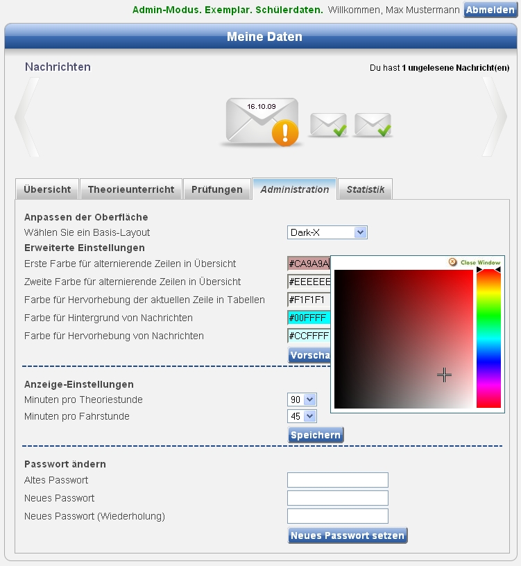 Wie VFWeb aus Sicht eines Fahrschülers aussieht, können Sie selbst anhand der Live-Demo herausfinden. Die folgenden Screenshots zeigen den Administrationsbereich von VFWeb sowie eine der Statistiken.