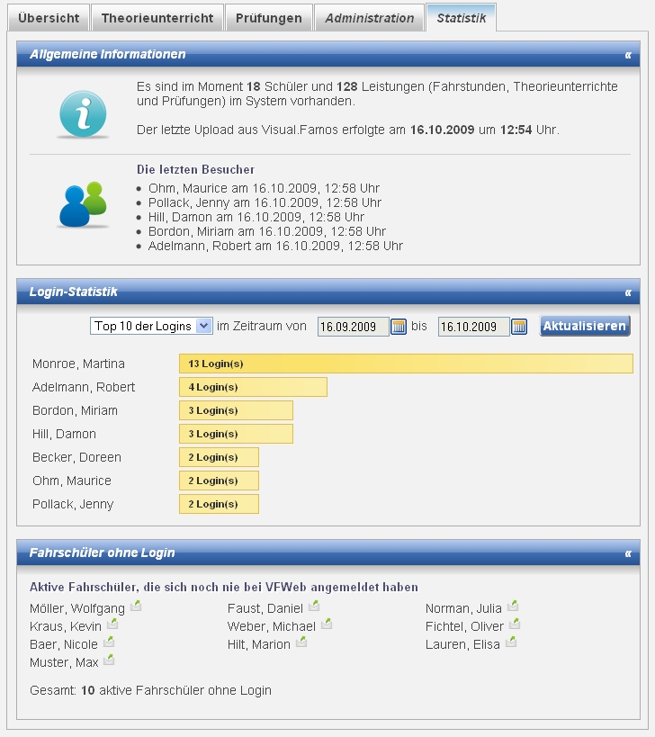 (*)Tipp: Nutzen Sie diese Statistiken, um beispielsweise Verlosungen unter allen Fahrschülern, die sich in einem bestimmten Zeitraum eingeloggt haben, durchzuführen und so den Verkehr auf Ihrer Seite noch weiter zu erhöhen und ggf. zusätzliche Werbeeinnahmen zu erzielen. VFWeb bietet eine Platform für unzählige, innovative Ideen.